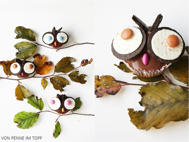 Bei Penne im Topf schauen derweil große Eulenkulleräuglein aus dem Raschelpapier. Ich find einfach super, was man aus Muffins alles zaubern kann.